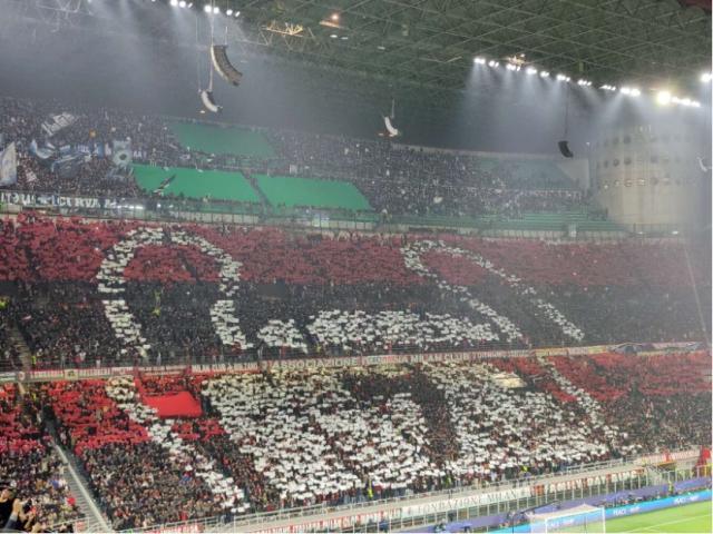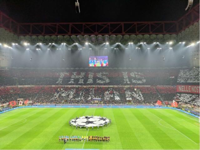 象征着米兰的红色魔鬼,将代表那不勒斯的面具人玩弄于掌间,两侧则是气势磅礴的横幅:“命运在我们自己手中!”时隔11年迎回欧冠八强战,南看台用这样的方式为主队米兰打气,而在对面的看台上,球迷们用手中红黑白三色的纸牌,呈现出象征着七次欧冠得主的标志——这是属于AC米兰的特权。巨型横幅环绕四面看台,就连媒体席工作台前面的挡板,也被换成了红黑色,这在笔者现场报道的记忆中还是第一次。